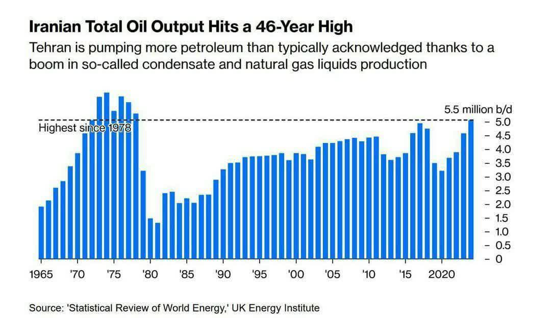 ایران به بالاترین سطح تولید نفت در چهار و نیم دهه اخیر دست یافته است. بر اساس گزارش مرور آماری انرژی جهان از مؤسسه