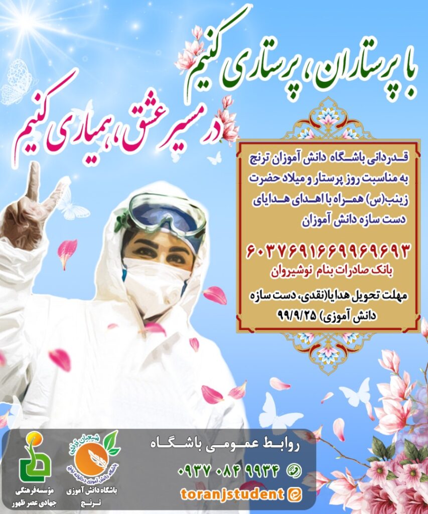 به گزارش پایش صنعت مدیریت باشگاه فرهنگی دخترانه ترنج در این رابطه اظهار داشت: با توجه به فرا رسیدن ایام ولادت با سعادت حضرت زینب (س) و روز پرستار به پاس قدردانی از زحمات پرستاران در روز شنبه۲۹ آذر ماه ۹۹ با حضور در بیمارستان رازی از زحمات آنان قدردانی به عمل می آید.