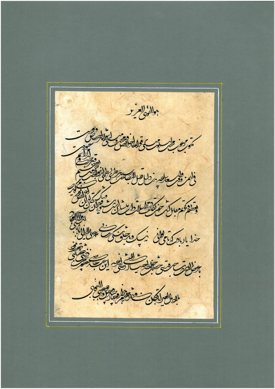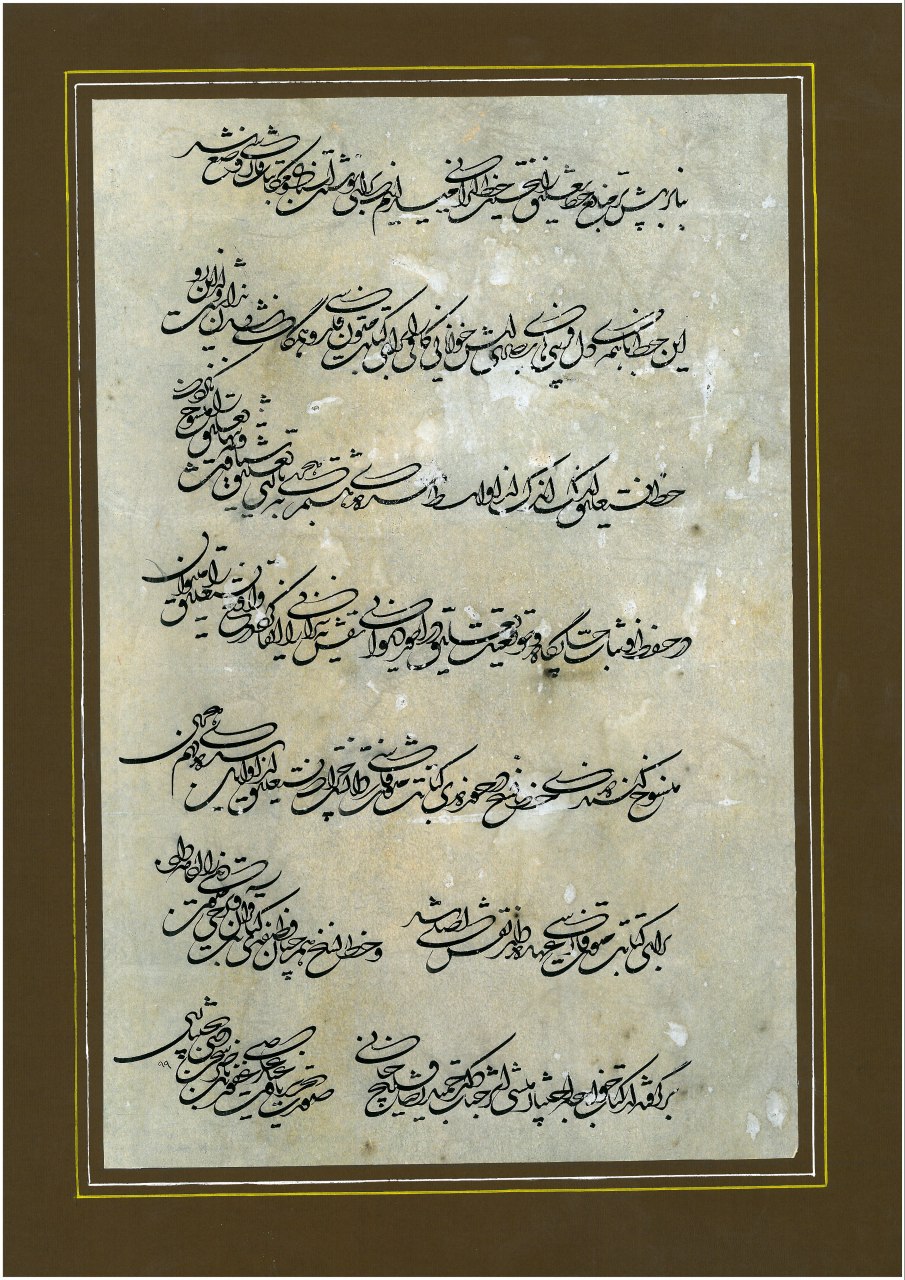 برای غفور  خانه به دوش هنر، احیاگر خط تعلیق به پاس ۳۵ سال دوستی و آوارگی  در عالم هنر و فرهنگ،  ﺗﻌﻠﻴﻖ ﺁﺭﺍﻣﺶ ﺟﺎﻥ ﺍﻭﺳﺖ؛ ﺗﻌﻠﻴﻖ ﻳﺎ ﺗﺮﺳﻞ ﺍﻭﻟﻴﻦ ﺷﻴﻮﻩ ﺍﺯ ﺧﻮﺷ‌‌ﻨﻮﻳﺴﯽ ﺍﻳﺮﺍﻧﯽ ﺍﺳﻼﻣﯽ ﺍﺳﺖ و ﺧﺎﺹ ﺍﻳﺮﺍﻧﻴﺎﻥ. ﺧﻄﯽ ﮐﻪ ﺍﺯ ﺗﺮﮐﻴﺐ ﻭ ﺗﻮﺳﻌﻪ ی ﺗﻮﻗﻴﻊ ﻭ ﺭﻗﺎﻉ ﻭ ﺗﺤﺖ ﺗﺎﺛﻴﺮ ﺧﻄﻮﻁ ﺍﻳﺮﺍﻧﯽ ﭘﻴﺶ ﺍﺯ ﺍﺳﻼﻡ ﮐﻪ ﺑﺎ پشت‌کاﺭ ﻭ ﺫﻭﻕ ﺍﻳﺮﺍﻧﻴﺎﻥ ﺑﻪ ﻭﺟﻮﺩ ﺁﻣﺪ. ﺧﻄﯽ ﮐﻪ ﺑﻪ ﺩﻟﻴﻞ ﻗﺎﺑﻠﻴﺖ ﻫﺎﯼ ﻓﺮﺍﻭﺍﻥ ﺩﺭ ﺍﺭﺍﺋﻪ ی ﺗﺮﮐﻴﺐ ﻫﺎﯼ ﻣﺘﻨﻮﻉ ﺑﻴﺸ‌ﺘﺮ ﺩﺭ ﺑﻴﻦ ﺧﻮﺍﺹ ﺟﺎﻣﻌﻪ ﻃﺮف‌دﺍﺭ ﺩﺍشته ﻭ ﻭﻳﮋﻩ ی ﮐﺎﺗﺒﺎﻥ ﺣﮑﻮﻣﺘﯽ ﺑﻮﺩ ﻭ ﻓﺮﺍﻣﻴﻦ و احکام امیران و پادشاهان ﺑﺎ ﺍﻳﻦ ﺧﻂ ﻧﻮﺷﺘﻪ ﻣﯽ ﺷﺪ.