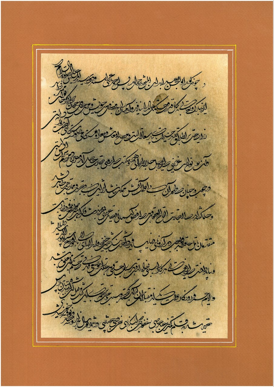 ﺧﻄﯽ ﮐﻪ ﺍﺯ ﺗﺮﮐﻴﺐ ﻭ ﺗﻮﺳﻌﻪ ی ﺗﻮﻗﻴﻊ ﻭ ﺭﻗﺎﻉ ﻭ ﺗﺤﺖ ﺗﺎﺛﻴﺮ ﺧﻄﻮﻁ ﺍﻳﺮﺍﻧﯽ ﭘﻴﺶ ﺍﺯ ﺍﺳﻼﻡ ﮐﻪ ﺑﺎ پشت‌کاﺭ ﻭ ﺫﻭﻕ ﺍﻳﺮﺍﻧﻴﺎﻥ ﺑﻪ ﻭﺟﻮﺩ ﺁﻣﺪ. ﺧﻄﯽ ﮐﻪ ﺑﻪ ﺩﻟﻴﻞ ﻗﺎﺑﻠﻴﺖ ﻫﺎﯼ ﻓﺮﺍﻭﺍﻥ ﺩﺭ ﺍﺭﺍﺋﻪ ی ﺗﺮﮐﻴﺐ ﻫﺎﯼ ﻣﺘﻨﻮﻉ ﺑﻴﺸ‌ﺘﺮ ﺩﺭ ﺑﻴﻦ ﺧﻮﺍﺹ ﺟﺎﻣﻌﻪ ﻃﺮف‌دﺍﺭ ﺩﺍشته ﻭ ﻭﻳﮋﻩ ی ﮐﺎﺗﺒﺎﻥ ﺣﮑﻮﻣﺘﯽ ﺑﻮﺩ ﻭ ﻓﺮﺍﻣﻴﻦ و احکام امیران و پادشاهان ﺑﺎ ﺍﻳﻦ ﺧﻂ ﻧﻮﺷﺘﻪ ﻣﯽ ﺷﺪ. ﺗﻌﻠﻴﻖ ﺣﺪﻭﺩ ﺻﺪ و پنجاه ﺳﺎﻝ ﺭﻭﺍﺝ ﮐﺎﻣﻞ ﺩﺍﺷﺖ ﺍﻣﺎ ﺁﺭﺍﻡ ﺁﺭﺍﻡ ﺍﺯ ﺭﻭﻧﻖ ﺍﻓﺘﺎﺩ.  و اما؛ ﺩﺭ ﻫﻴﺎﻫﻮﯼ ﺯﻧﺪﮔﯽ ﻣﺎﺷﻴﻨﯽ ﻭ ﻣﻌﺎﺻﺮ ﻣﺎ ﻫﻨﺮﻣﻨﺪ ﺧﻮﺷﻨﻮﻳﺲ ﻏﻔﻮﺭ ﺳﺨﻦﺩﺭﯼ ﺑﺨﺘﻴﺎﺭﯼ ﺳﺎل‌هاﺳﺖ که ﺟﻮﺍﻧﯽ ﺧﻮﻳﺶ ﺭﺍ ﺩﺭ ﺭﺍﻩ ﺯﻧﺪﻩ ﮐﺮﺩﻥ ﺩﻭﺑﺎﺭﻩ ی ﺍﻳﻦ ﺧﻂ ﮔﺬﺍﺷﺘﻪ ﺍﺳﺖ. عزیزی ﮐﻪ ﺧﺮﺩ ﻳﺎﺭ ﻭ ﻓﺮﻫﻨﮓ ﺁﻣﻮﺯﮔﺎﺭ ﺍﻭﺳﺖ ﻏﻔﻮﺭ ﺳﺨﻦﺩﺭﯼ ﺑﺨﺘﻴﺎﺭﯼ ﺭﺍ ﺳﺎﻟﻬﺎﺳﺖ ﻣﯽ ﺷﻨﺎﺳﻢ ﺍﻭ به ﺳﺎﻝ ۱۳۵۳ ﺩﺭ ﺳﺮﺯﻣﻴﻦ ﻓﺮﻫﻨﮓ، ﻫﻨﺮ، ﺣﻤﺎﺳﻪ ﻭ ﺷﺎﻫﻨﺎﻣﻪ ﺍﻳﺬﻩ ﺳﺮﺯﻣﻴﻨﯽ ﮐﻪ ﺣﺎﻓﻆ ﺭﺍ ﻫﻢ ﺑﻪ شگفتی و ﺗﺤﺴﻴﻦ ﻭﺍﺩﺍﺷﺘﻪ ﺍﺳﺖ: