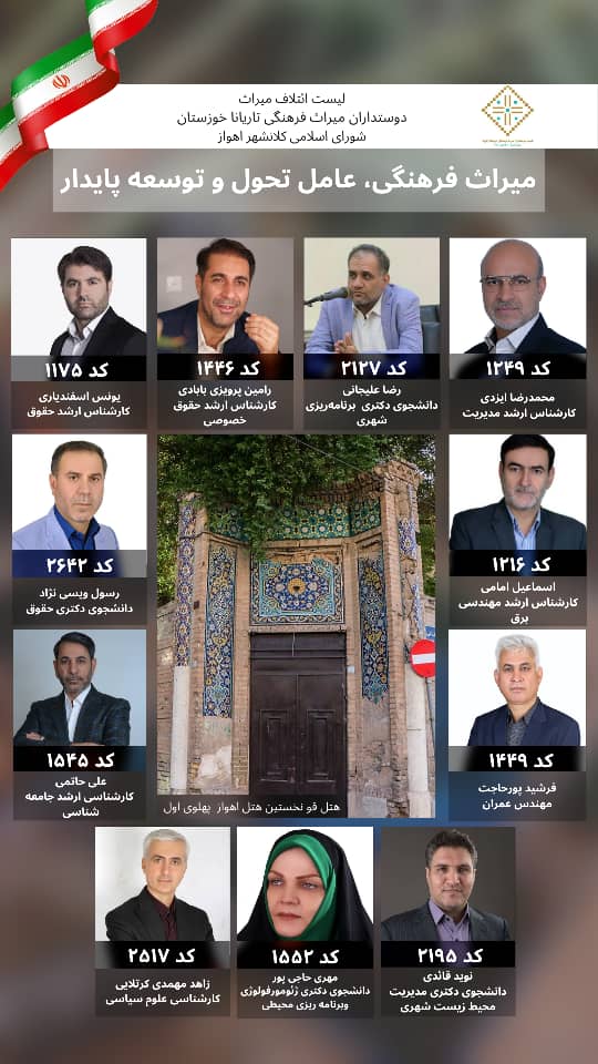 در همین راستا انجمن دوستداران میراث فرهنگی تاریانا خوزستان منتخبین خود را در حوزه میراث فرهنگی بر اساس حروف الفبا به شرح زیر اعلام می‌دارد.