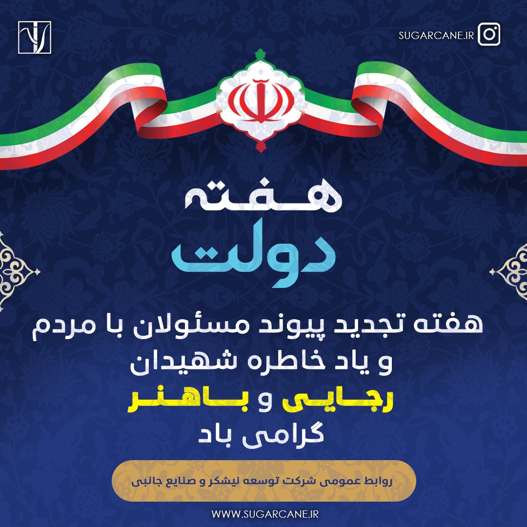 اینجانب ضمن گرامیداشت یاد و خاطره شهدای والا مقام دولت و بویژه شهیدان رجایی و باهنر، هفته دولت را به خانواده بزرگ توسعه نیشکر تبریک عرض نموده، موفقیت همگان را در راستای تحقق آرمان های بلند حضرت امام خمینی(ره) و مقام معظم رهبری و اهداف مهم دولت از درگاه خداوند متعال مسئلت می نمایم.