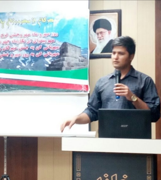 در بخش سخنرانی، نخست رضا پورعباس کارشناس ارشد زبان شناسی و از حافظ پژوهان استان خوزستان در سخنانی پیوندهای آیین مهر با اندیشه و شعر حافظ را یاد آور شد. این پژوهشگر نشانههای آیین مهر در شعر حافظ، ویژگیها و نشانههای آیین مهر، اهمیت راز نقش مستی، دانندگان راز در آیین مهر، محرمان راز در آیین مهر، نمونه های شعر حافظ که حکایت از ناگشوده ماندن راز بودند، نمونه های شعر حافظ در ترس وی از فاش شدن راز و عاقبت فاش شدن راز را مورد تجزیه و تحلیل قرار داد.وی همچنین اشاره کرد: واژههایی چون پیمان، عشق و مستی از جمله نشانههای آیین مهری هستند که در اشعار خواجه شیراز به فراوانی دیده میشوند.