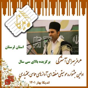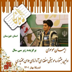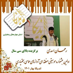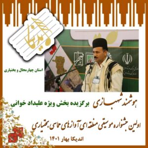 لازم به یاد آوری است: نخستین جشنواره منطقه ای موسیقی آوازهای حماسی بختیاری در سالن کتابخانه فردوسی شهر قلعه خواجه به میزبانی انجمن موسیقی اندیکا و همکاری اداره فرهنگ و ارشاد اسلامی شهرستان اندیکا برگزار شد.