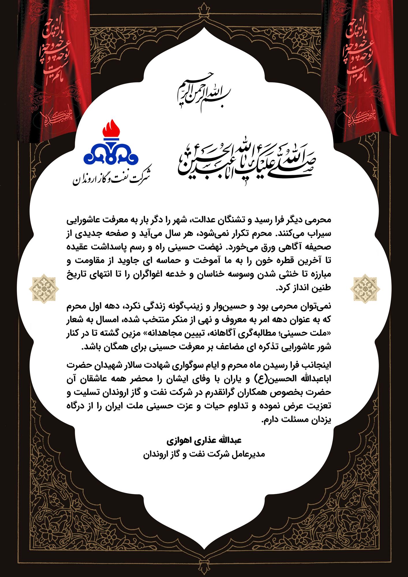 اینجانب فرا رسیدن ماه محرم و ایام سوگواری شهادت سالار شهیدان حضرت اباعبدالله الحسین(ع) و یاران با وفای ایشان را محضر همه عاشقان آن حضرت بخصوص همکاران گرانقدرم در شرکت نفت و گاز اروندان تسلیت و تعزیت عرض نموده و تداوم حیات و عزت حسینی ملت ایران را از درگاه یزدان مسئلت دارم.