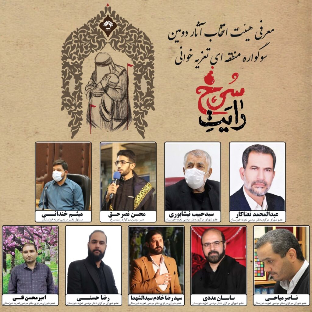 به گزارش پایگاه خبری پایش صنعت، سید حبیب الله نیشابوری، عبدالمحمد نعناکار، میثم خندانی، محسن نصرحق، ناصر میاحی، ساسان مددی، سیدرضا خادم سیدالشهداء، رضا حسنی و امیرمحسن فنی بهعنوان اعضای شورای مرکزی دفتر مردمی تعزیه خوزستان و اعضای هیئت دومین سوگواره تعزیهخوانی رایت سرخ در شهرستان بهبهان معرفی شدند.