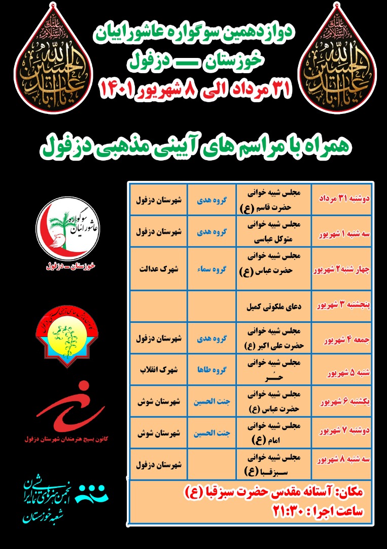 جدول اجرایی دوازدهمین سوگواره عاشورائیان دزفول به شرح زیر است: