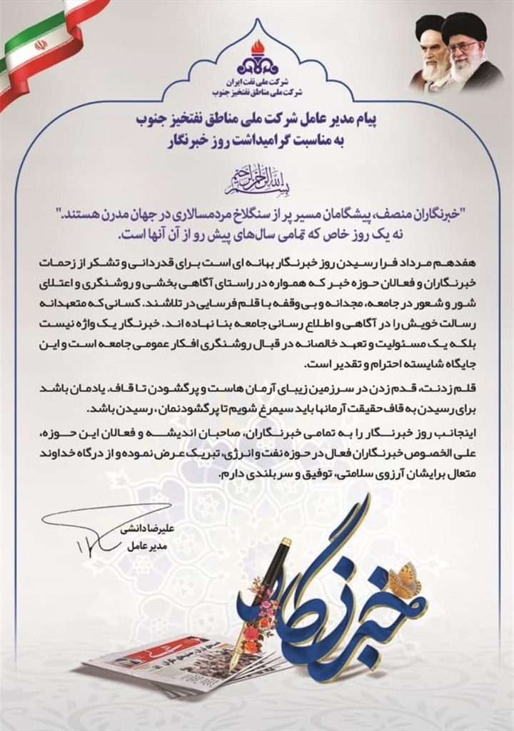 اینجانب روز خبرنگار را به تمامی خبرنگاران، صاحبان اندیشه و فعالان رسانه، بهویژه خبرنگاران فعال درحوزه نفت و انرژی، تبریک عرض نموده و از درگاه خداوند متعال برای آنان، سلامتی، توفیق و سربلندی آرزومندم.