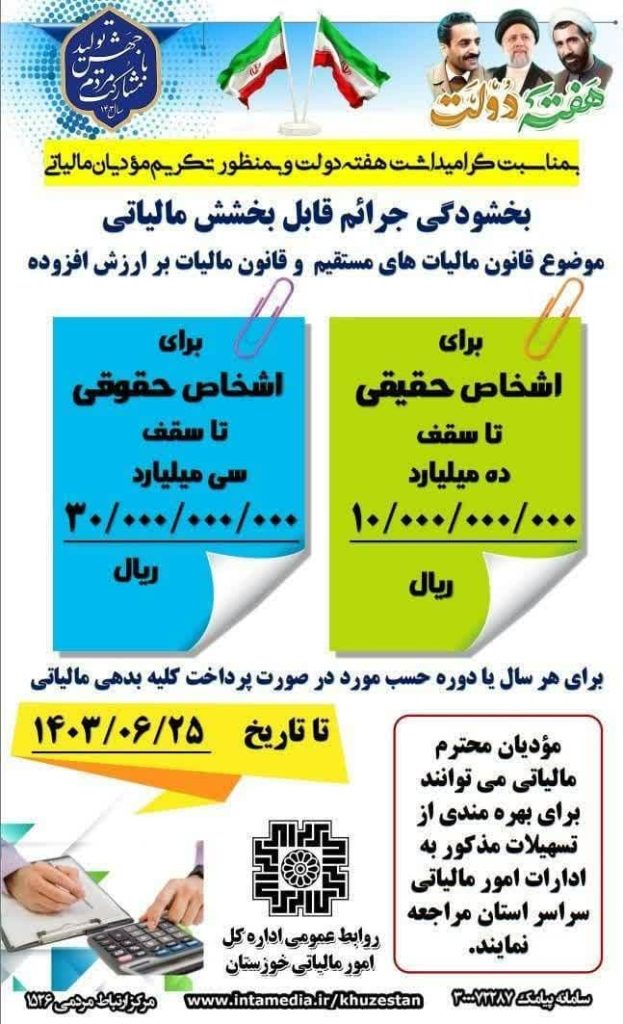 به اطلاع می رساند اختیار بخشودگی جرائم قابل بخشش مالیاتی موضوع قانون مالیاتهای مستقیم و قانون مالیات بر ارزش افزوده برای اشخاص حقیقی تا سقف ده میلیارد(۱۰،۰۰۰،۰۰۰،۰۰۰) ریال و برای اشخاص حقوقی تا سقف سی میلیارد (۳۰،۰۰۰،۰۰۰،۰۰۰) ریال برای هر سال یا دوره حسب مورد و در صورت پرداخت کلیه بدهی مالیاتی تا تاریخ ۱۴۰۳/۰۶/۲۵ به مدیران کل امور مالیاتی تفویض گردیده است لذا جهت استفاده از مزایا و تسهیلات مذکور در موعد مقرر به ادارات امور مالیاتی مربوطه مراجعه نمایید .