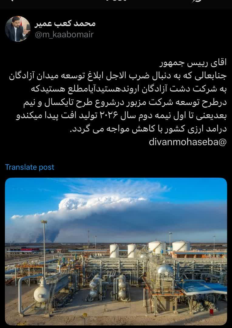 «آقای رئیسجمهور، جنابعالی که بهدنبال ضربالاجل برای ابلاغ توسعه میدان آزادگان به شرکت دشت آزادگان اروند هستید، آیا مطلع هستید که طبق طرح توسعه ارائهشده، از ابتدای اجرای پروژه تا حدود یکسالونیم پس از آن — یعنی تا آغاز نیمه دوم سال ۲۰۲۶ — تولید میدان دچار افت خواهد شد و این موضوع به کاهش درآمد ارزی کشور منجر میشود؟»
