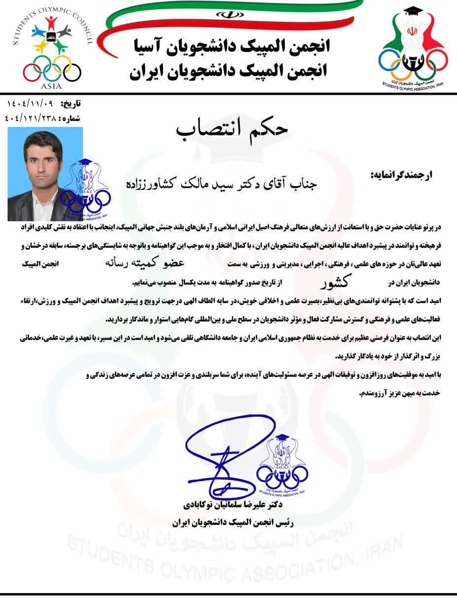 دکتر علیرضا سلمانیان نوکابادی، رئیس انجمن المپیک دانشجویان ایران، طی حکمی دکتر سید مالک کشاورززاده را به عضویت کمیته رسانه این انجمن منصوب کرد.