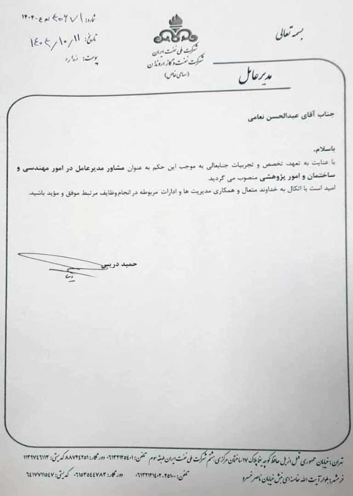 طی حکمی از سوی حمید دریس مدیرعامل شرکت نفت و گاز اروندان، عبدالحسن نعامی به عنوان مشاور مدیرعامل در امور مهندسی و ساختمان و امور