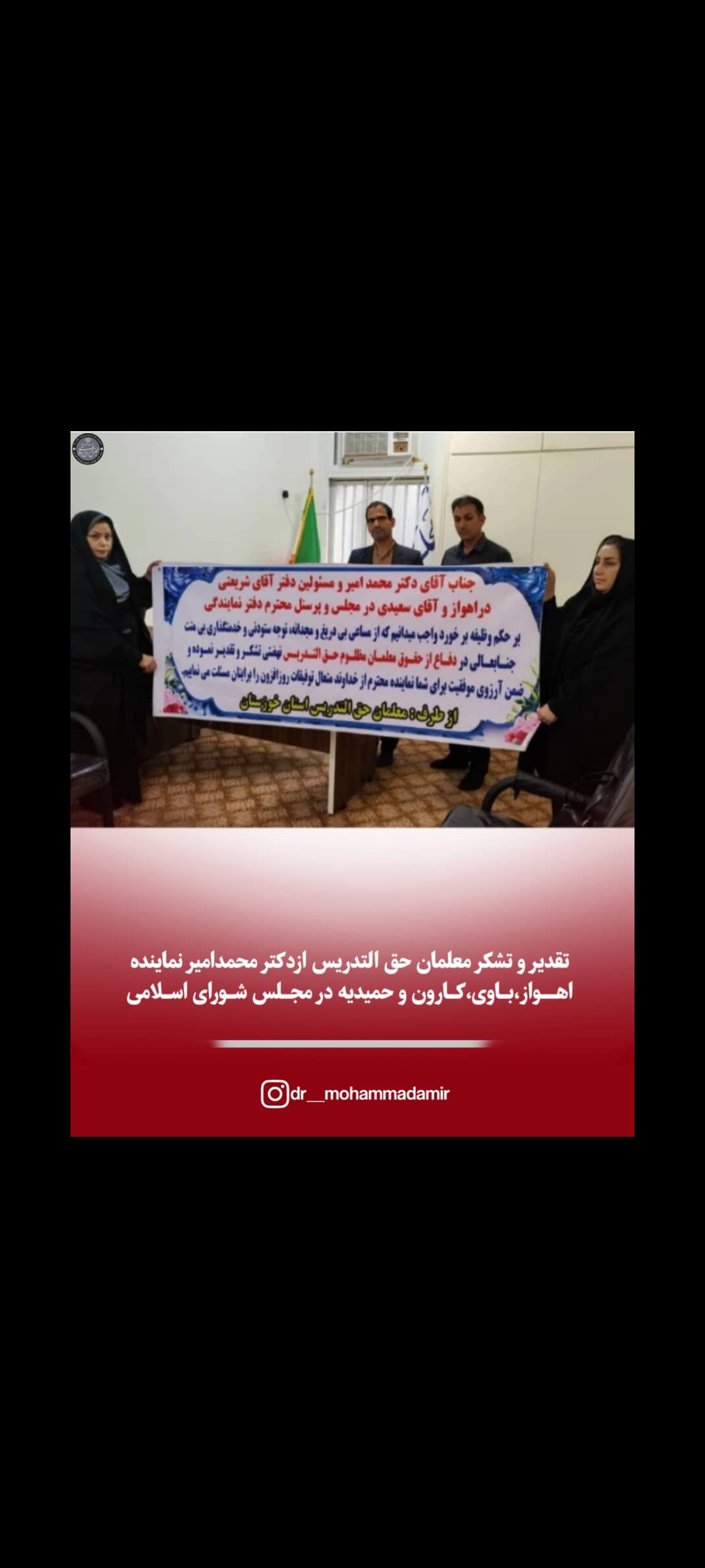 جمعی از معلمان حقالتدریس و فعالان عرصه آموزش و پرورش استان خوزستان با انتشار پیامی، از تلاشها و پیگیریهای مستمر دکتر محمد امیر، نماینده مردم