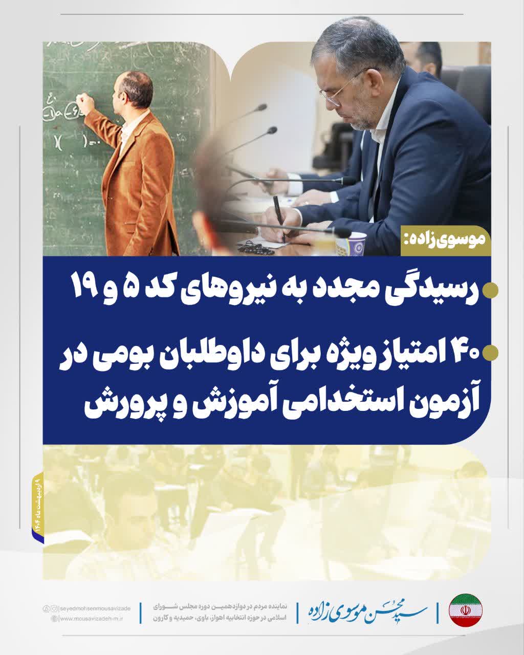 موسویزاده: 📌رسیدگی مجدد به نیروهای کد ۵ و ۱۹ 📌۴۰ امتیاز ویژه برای داوطلبان بومی در آزمون استخدامی آموزش و پرورش نماینده مردم اهواز، کارون،