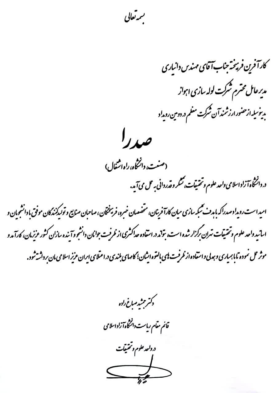 دکتر جمشید صباغ زاده در متن تقدیر خود خطاب به محمدرضا دانیاری آورده است: بدینوسیله از حضور ارزشمند آن شرکت معظم در دومین رویداد صدرا(صنعت،