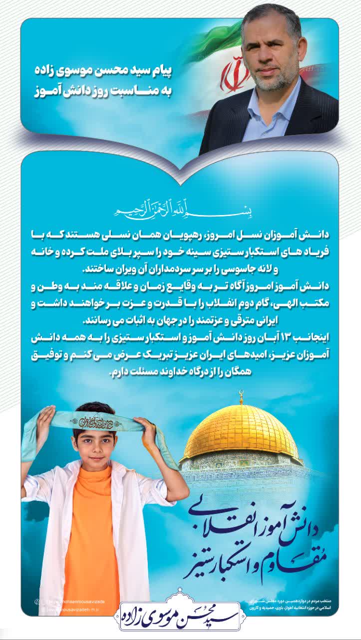 پیام سید محسن موسوی زاده به مناسبت روز دانش آموز بسم الله الرحمن الرحیم دانش آموزان نسل امروز، رهپویان همان نسلی هستند که با فریاد